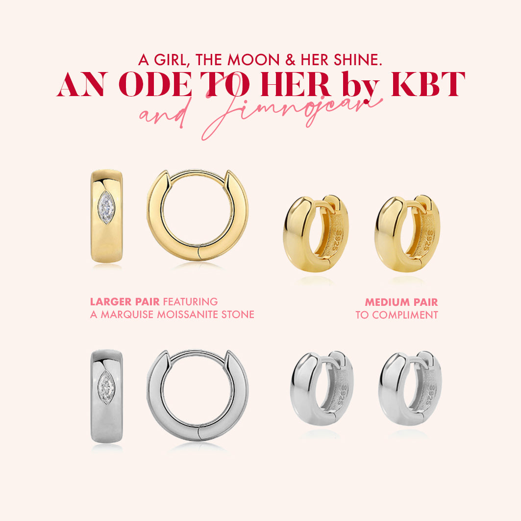 In the pink box, the larger pair of hoops features a marquise-cut Moissanite stone, graded by the GRA Diamond Institute (certificate included inside).