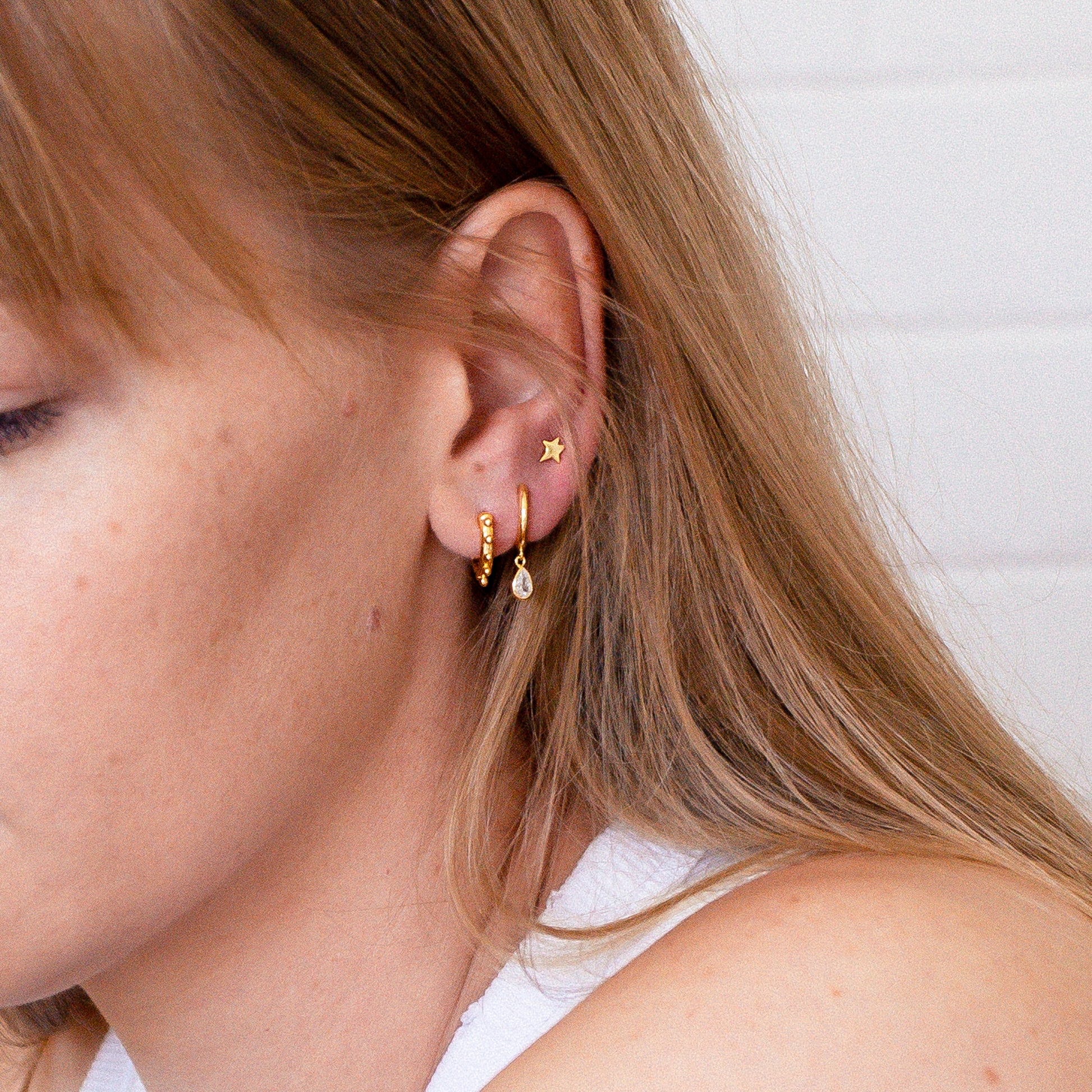 The Exploration Huggies are pictured here with the Dewdrop Huggies and the Wonky Star Studs.