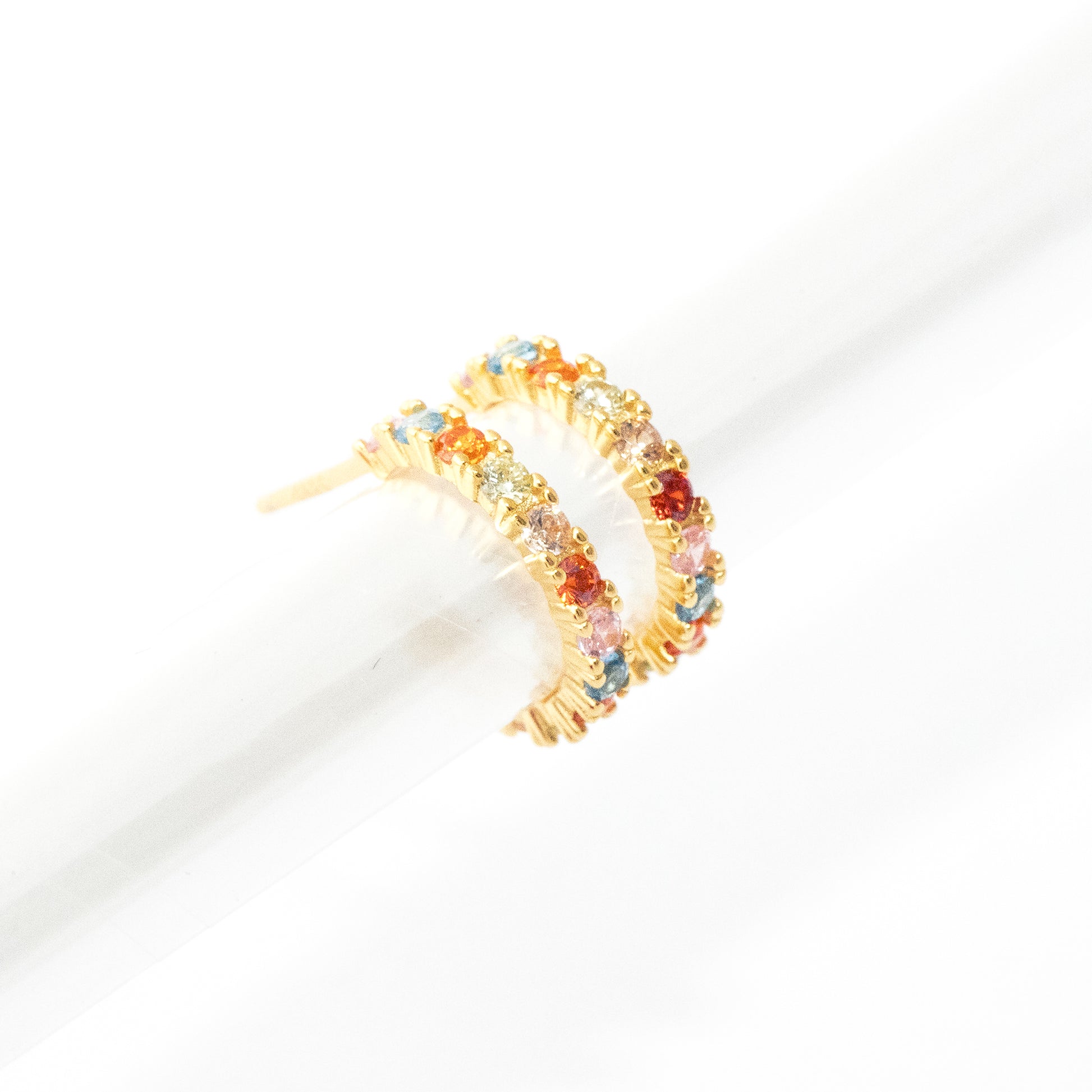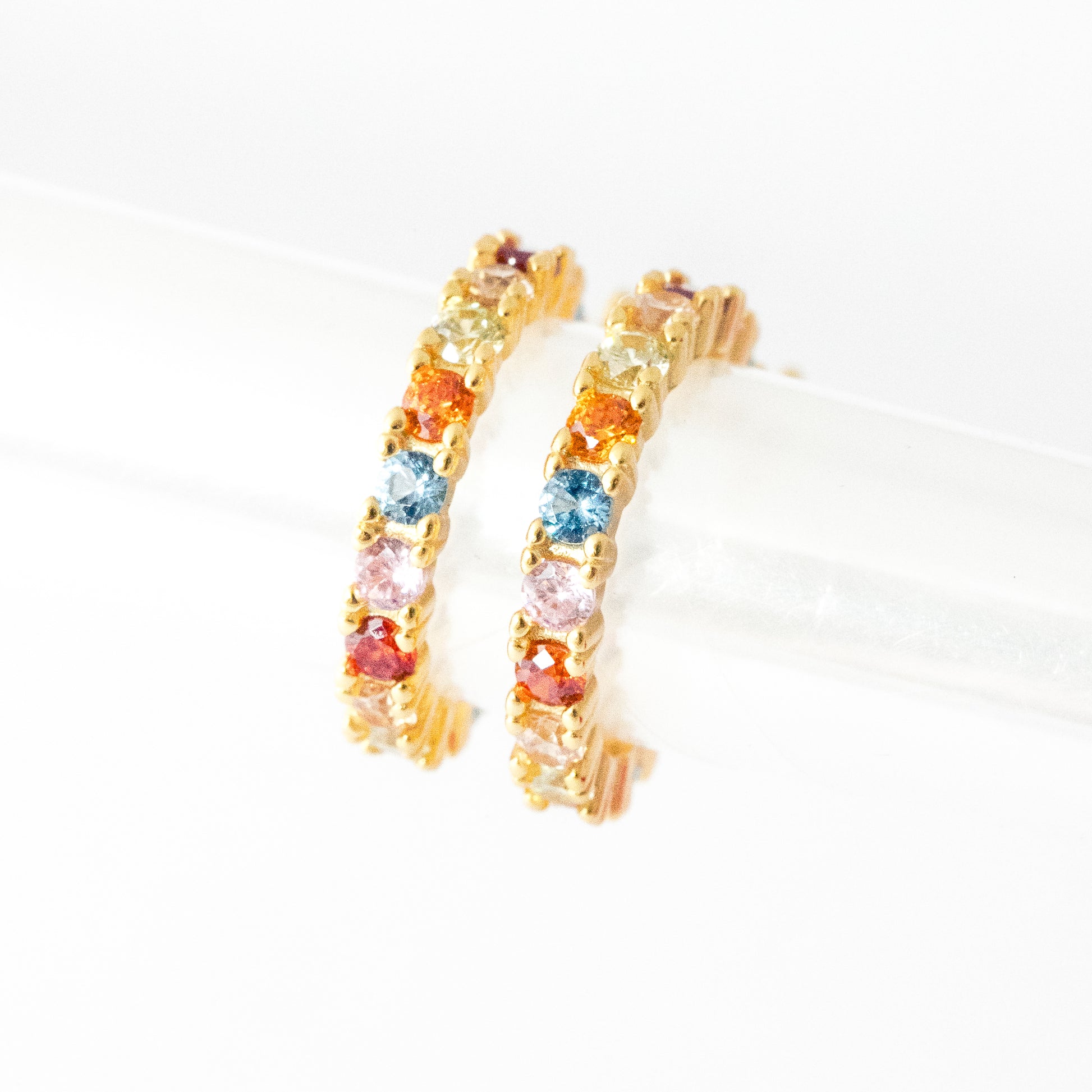 Adorned with an array of colourful vibrant gems, each hoop showcases a delightful mix of hues, from bold reds and sunny yellows to rich blues and greens. This lively combination adds a fun, eclectic vibe that instantly brightens up any outfit.