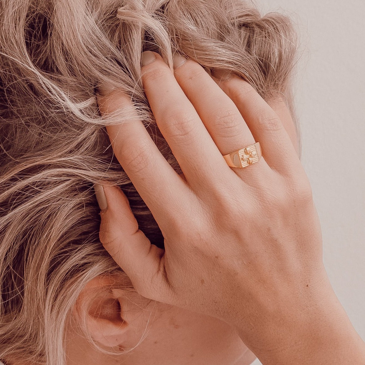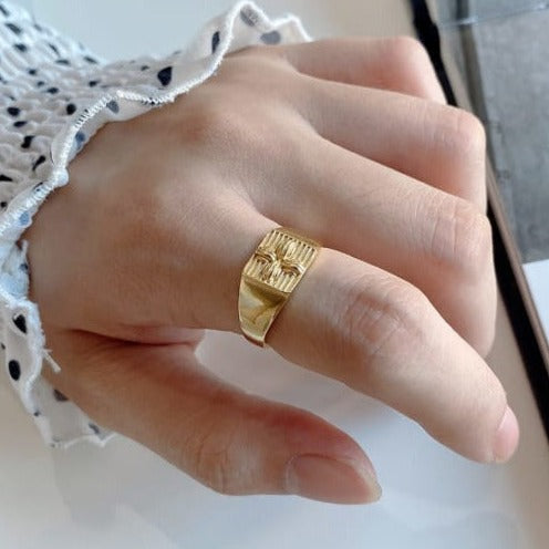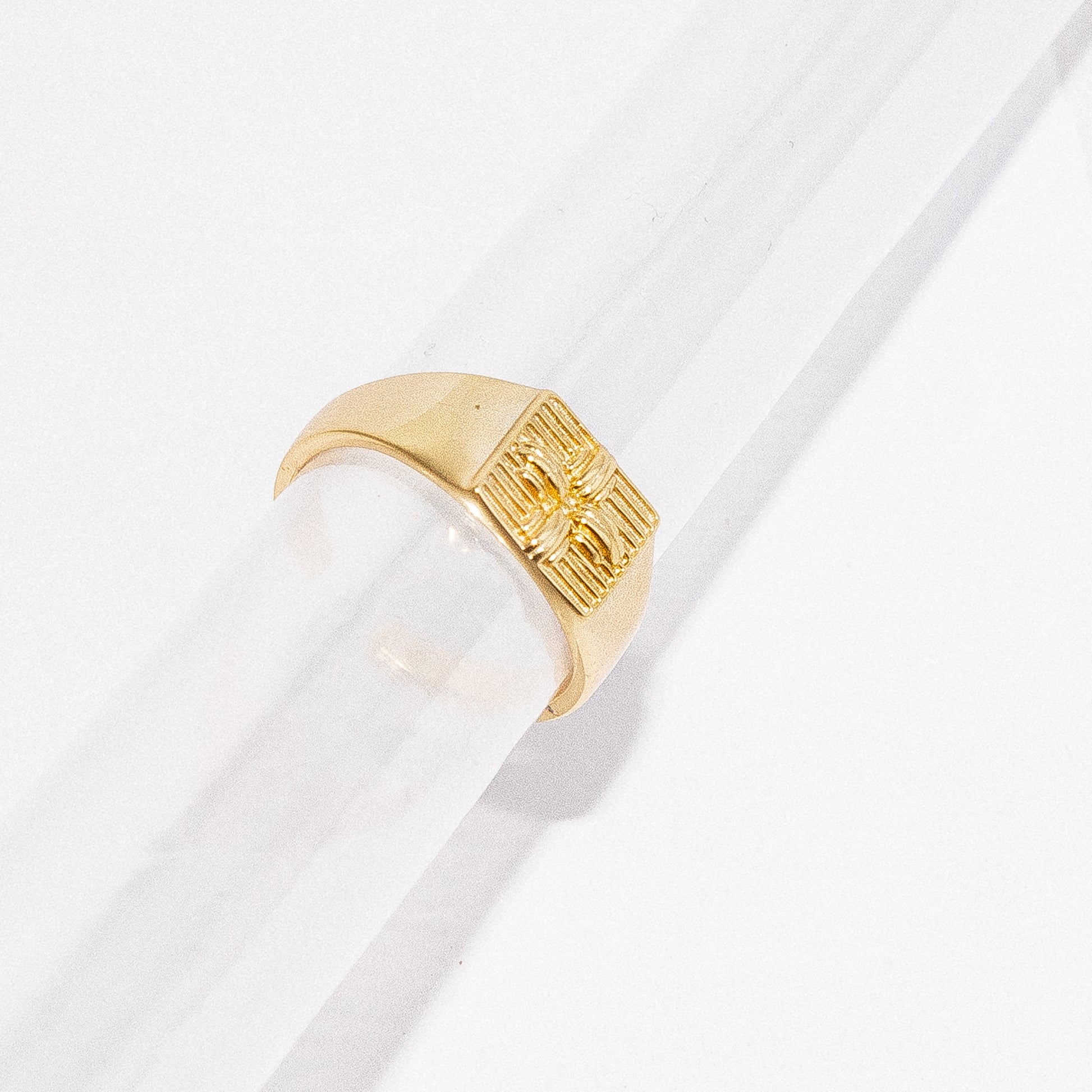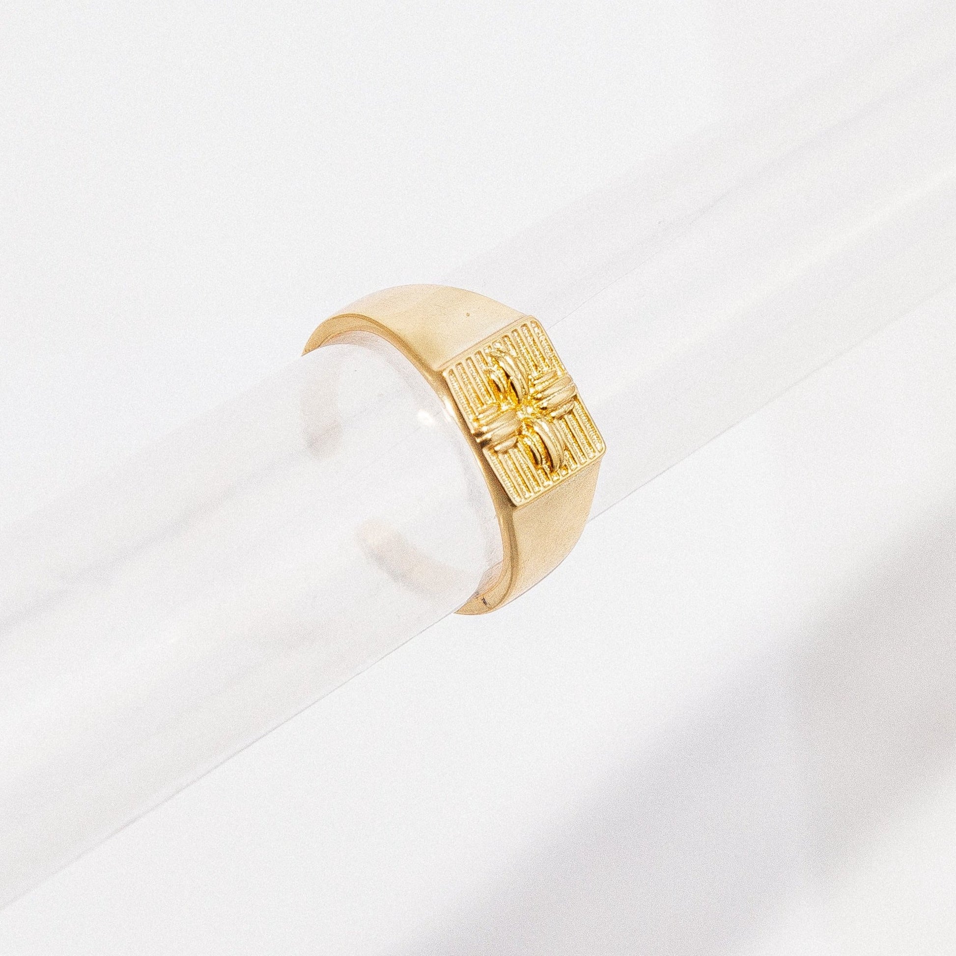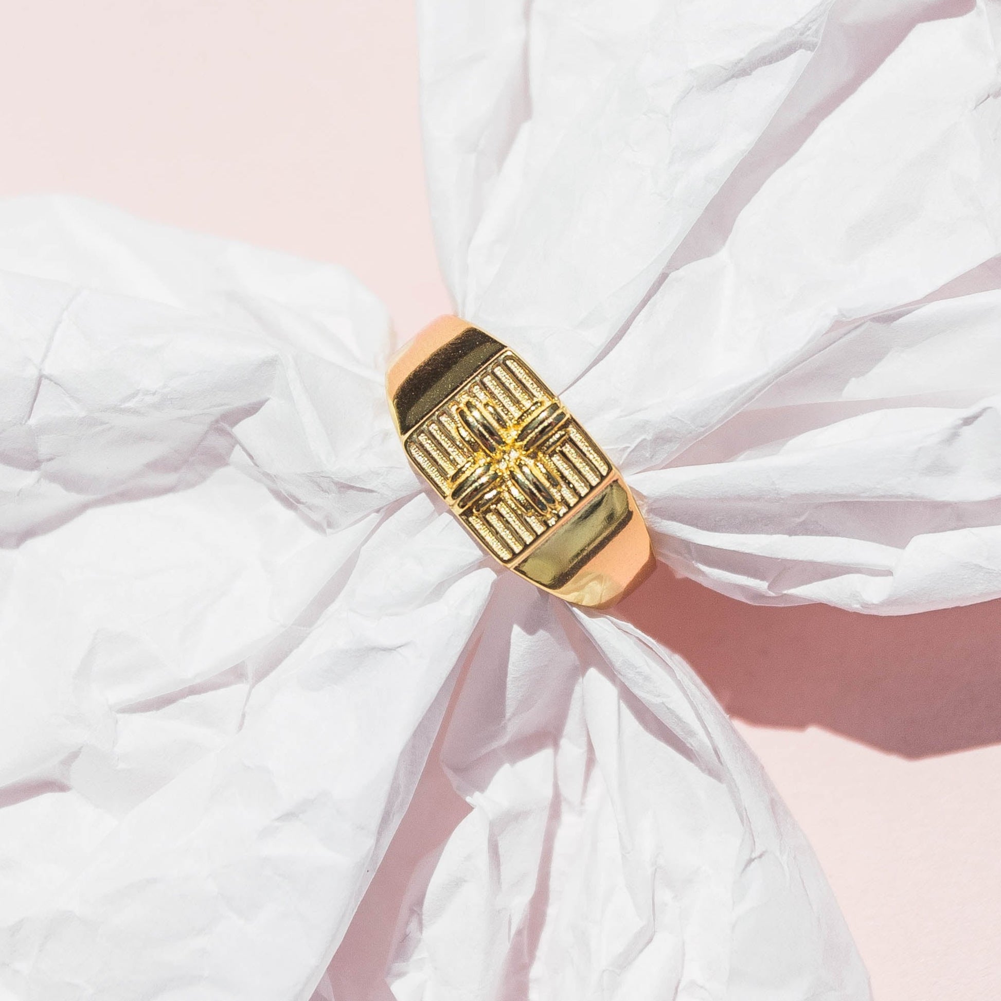 Our Heritage Ring is one size fits all with an open adjustable band & been created from 925 Sterling Silver and is 14kt Gold-Plated.
