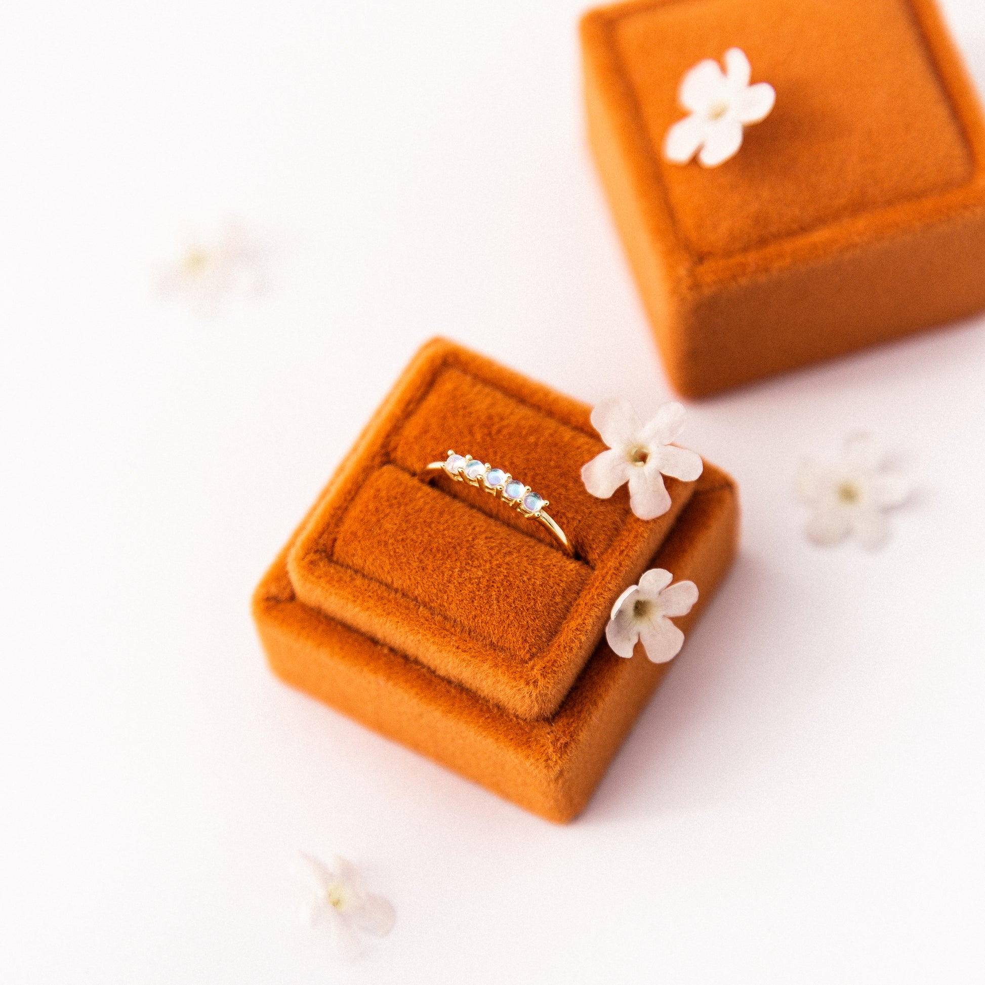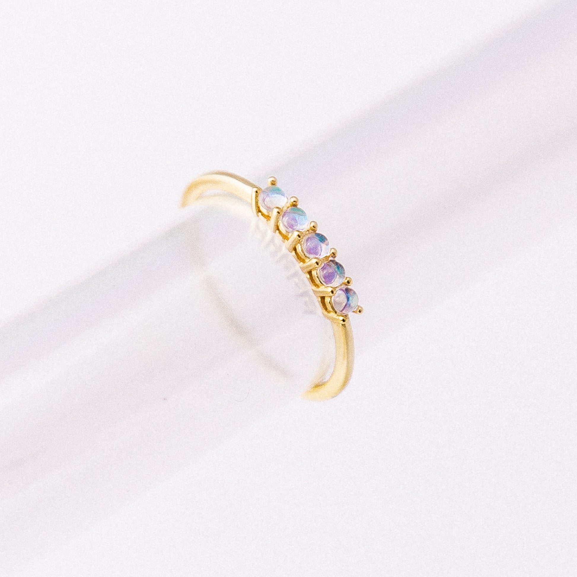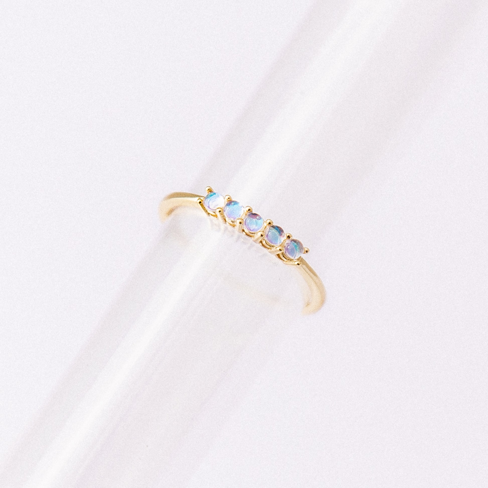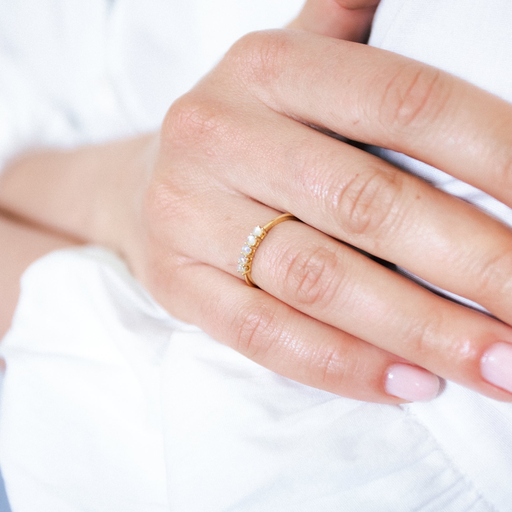 Introducing the Opal Moondrop Ring by Jimnojean. This playful ring features dainty Opal stones that dazzle in multiple colours depending on the light. Its ever-changing appearance will keep you entertained no matter how you look at it - a great addition to any stack!