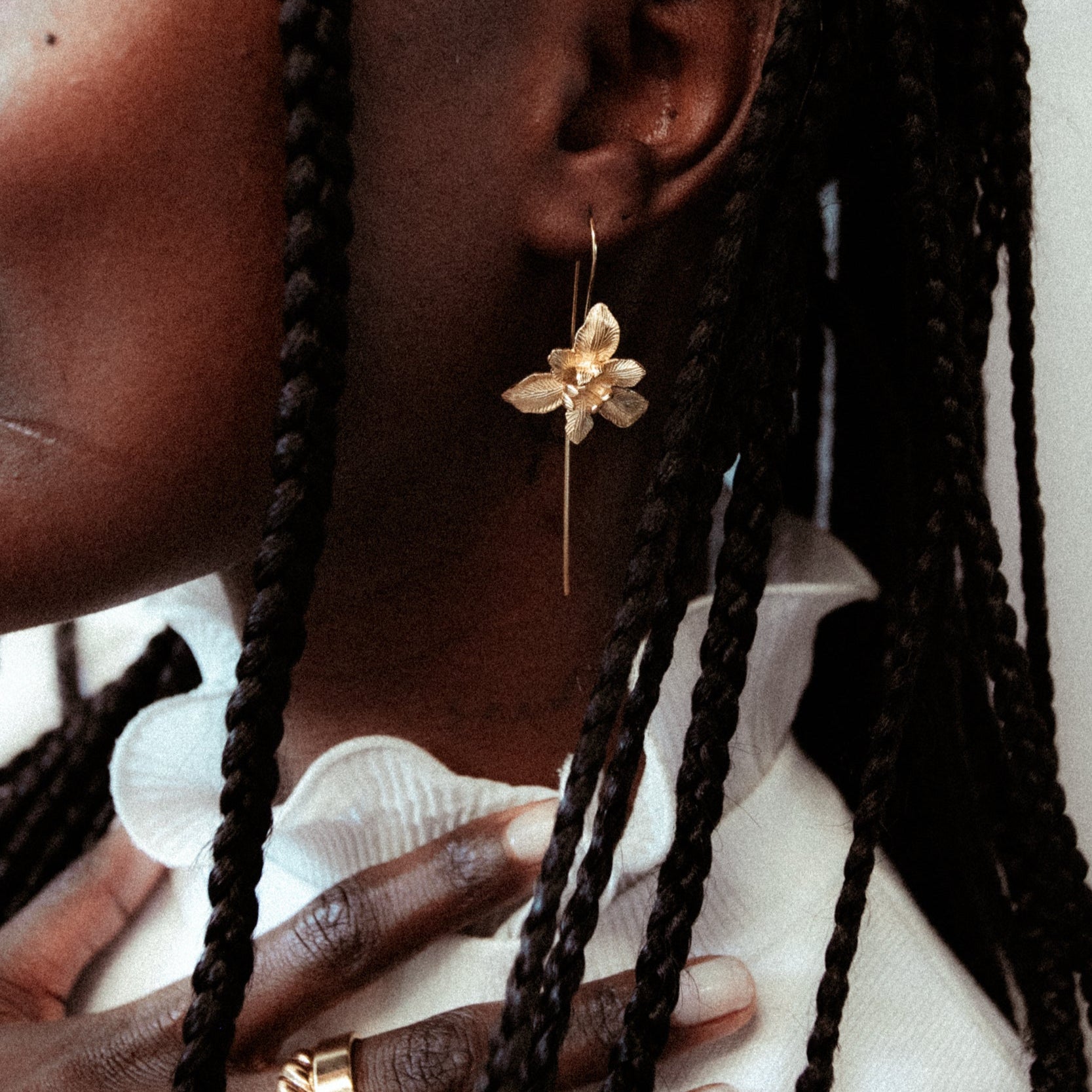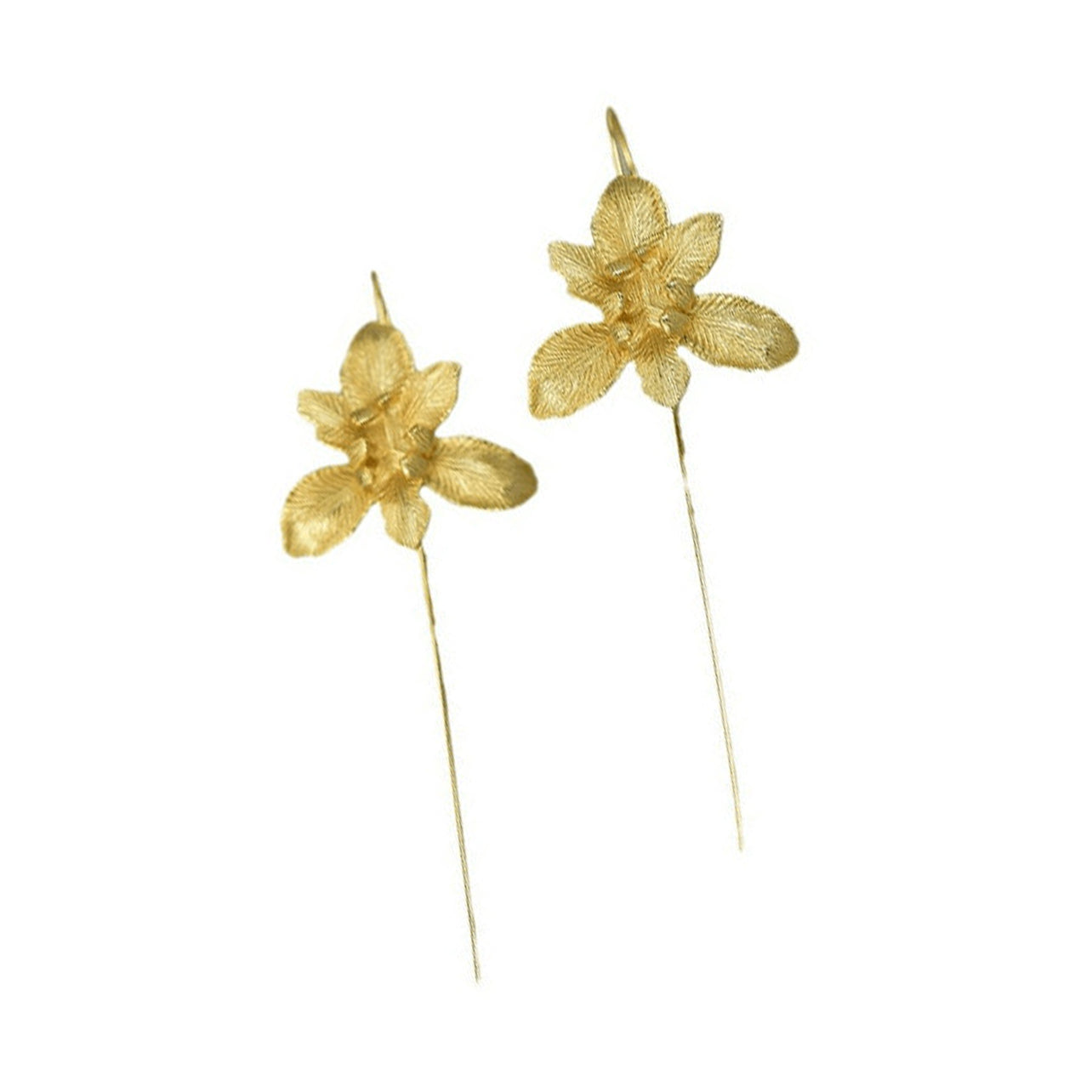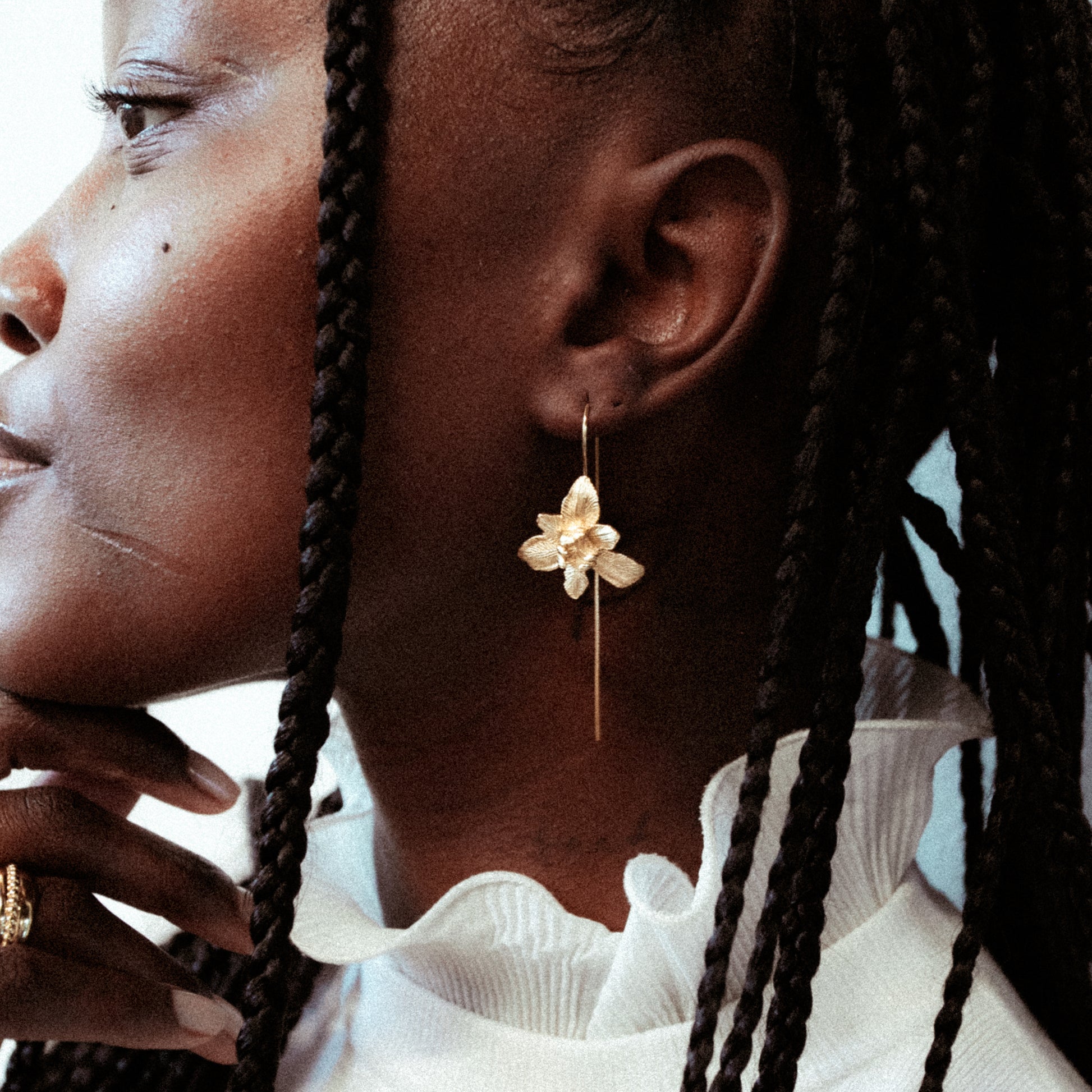 Like tiny sculptures for your ears, each orchid petal is a soft, golden bloom — delicate, dramatic, and impossibly beautiful. The flower floats gently from a sterling silver pin, creating a barely-there illusion that’s pure magic.