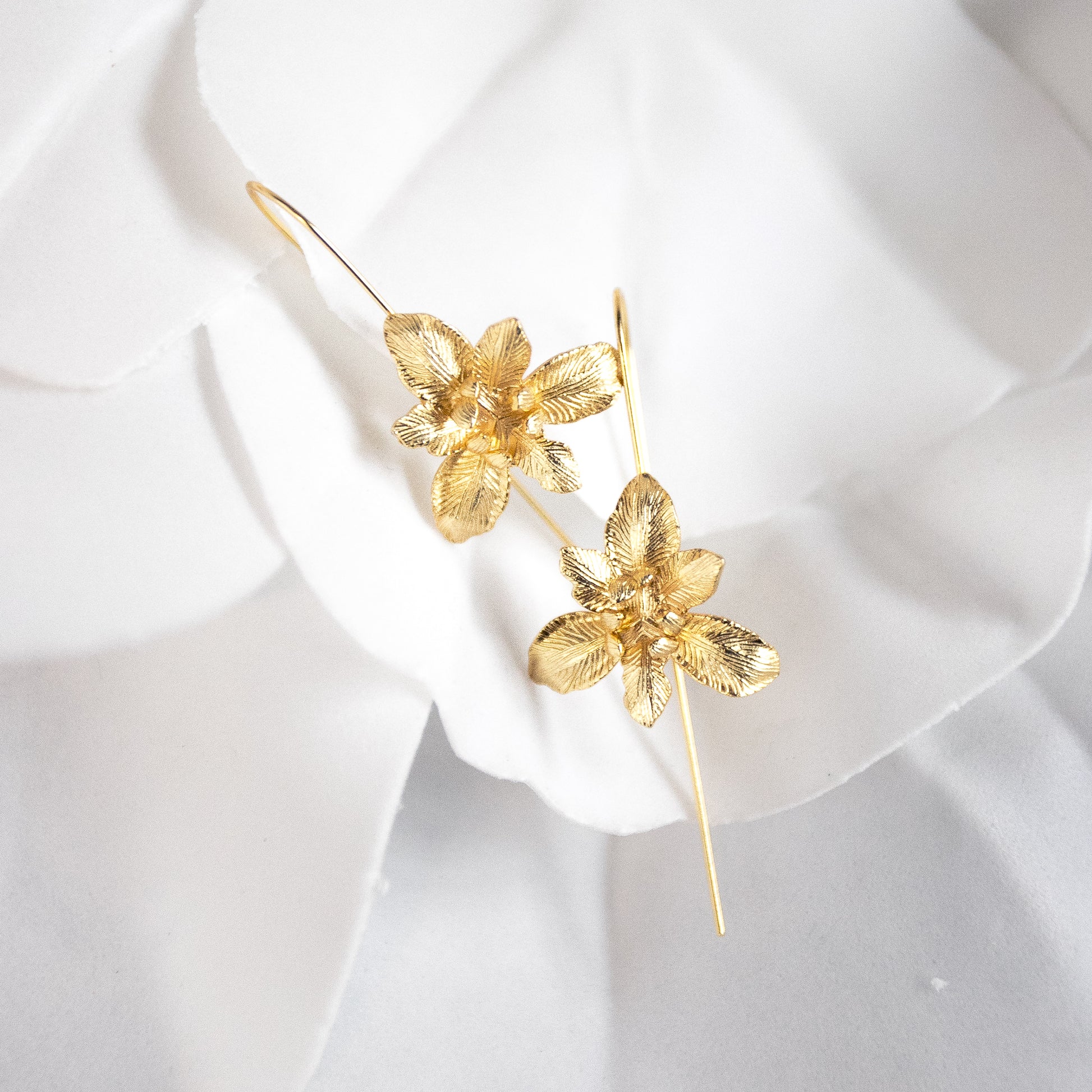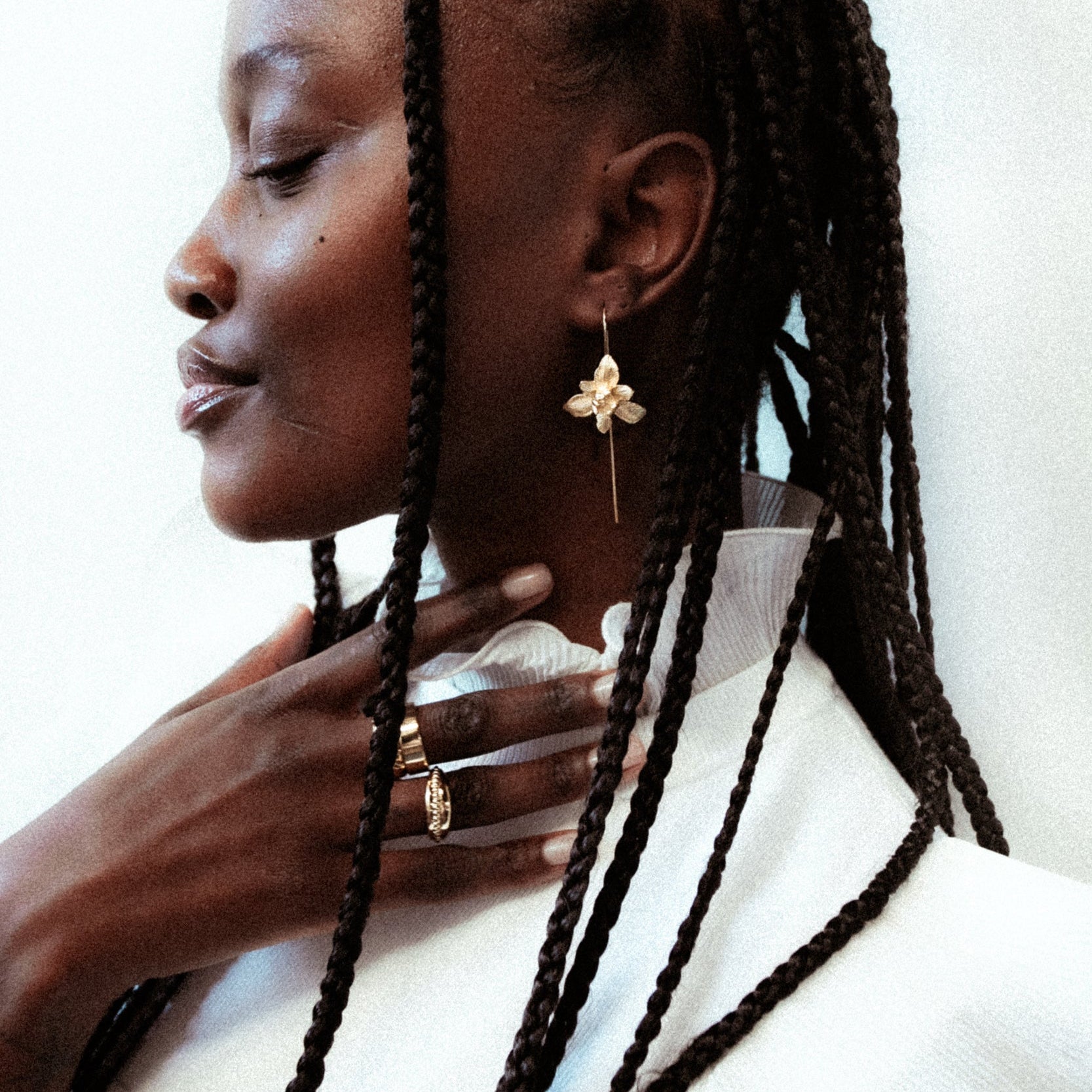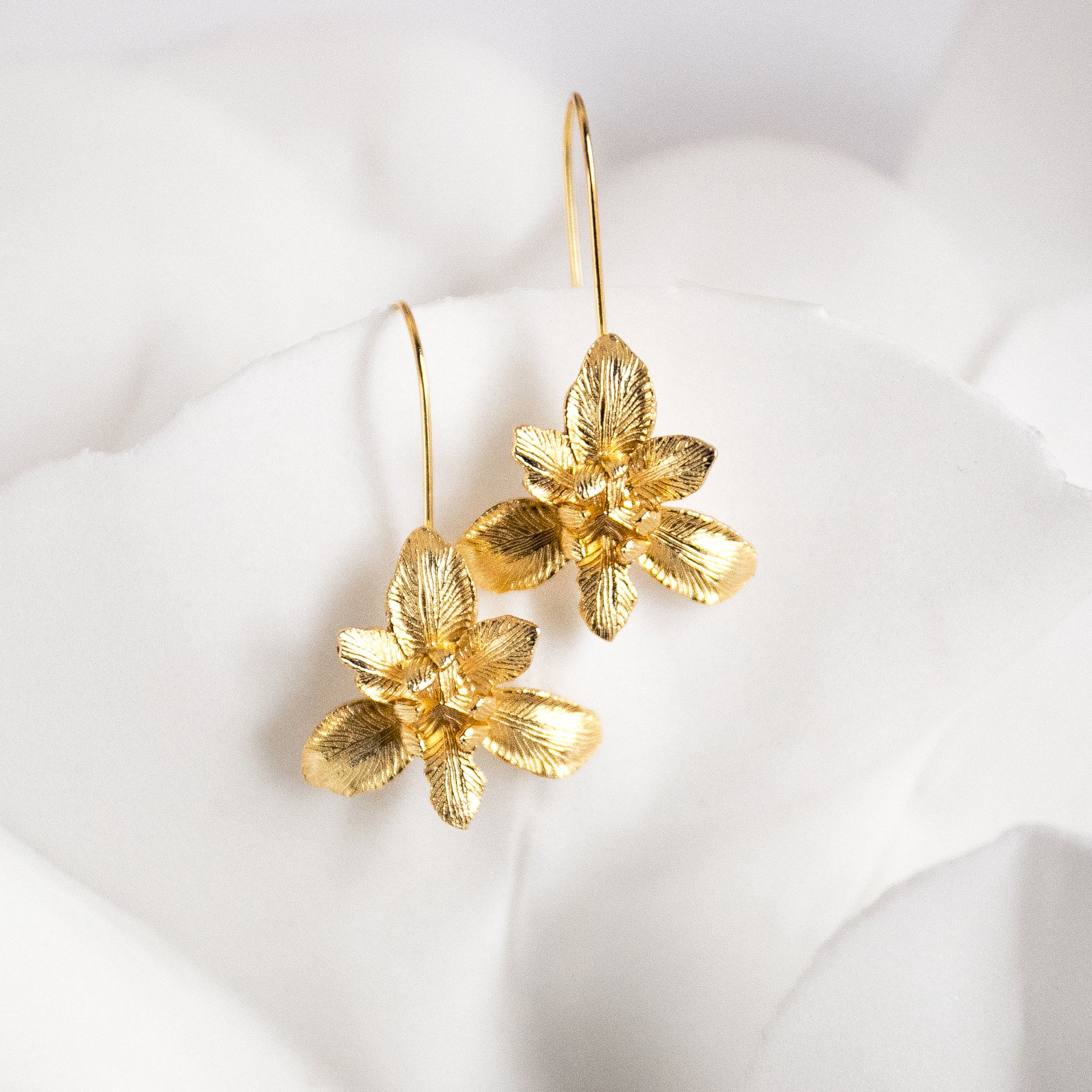 Like tiny sculptures for your ears, each orchid petal is a soft, golden bloom — delicate, dramatic, and impossibly beautiful. The flower floats gently from a sterling silver pin, creating a barely-there illusion that’s pure magic.