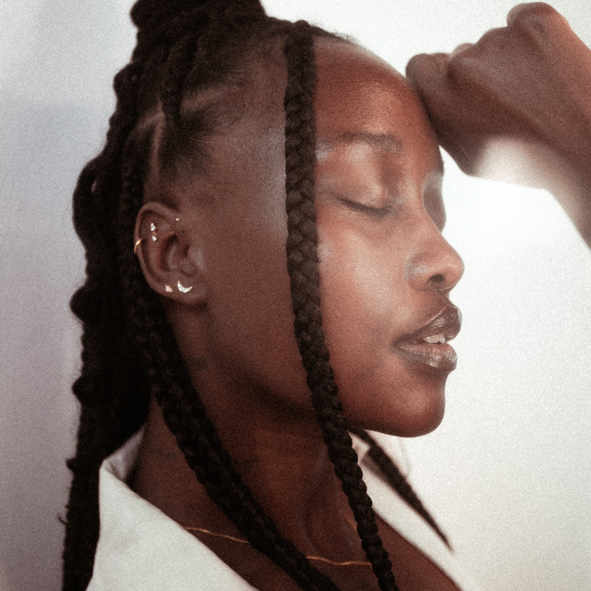 The Petite flatback is worn here with the Diamond Half Moon Studs in 9ct gold.