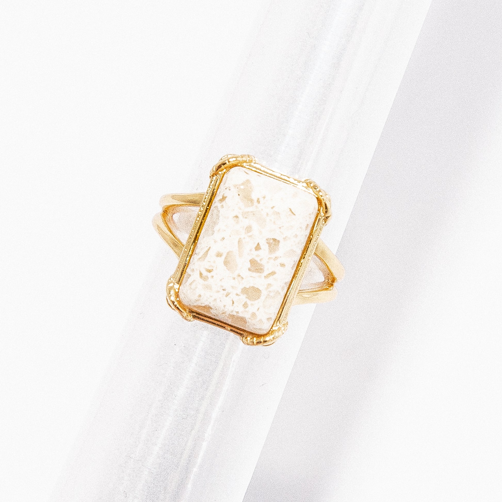 Crafted with love from 925 Sterling Silver and finished in 14kt Gold Plating, it features a beautiful vintage-inspired sandstone. This piece is one size fits all, with an open, adjustable band for a comfortable fit.