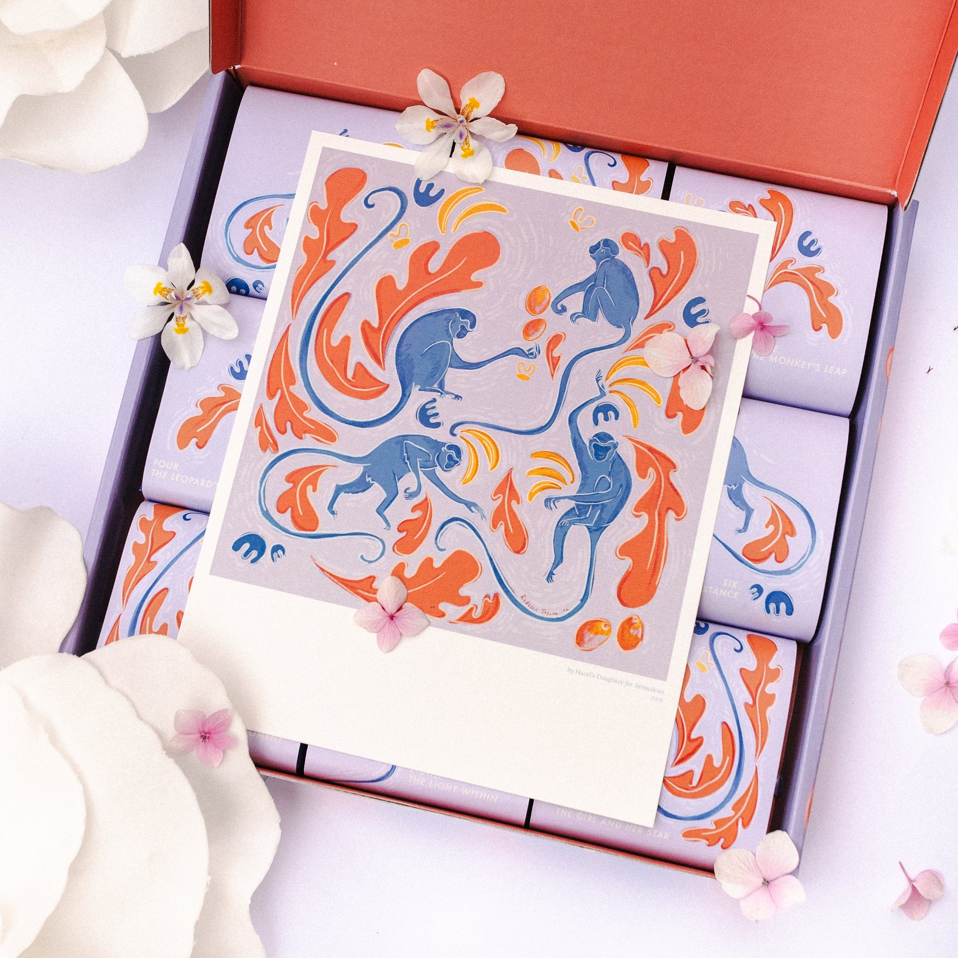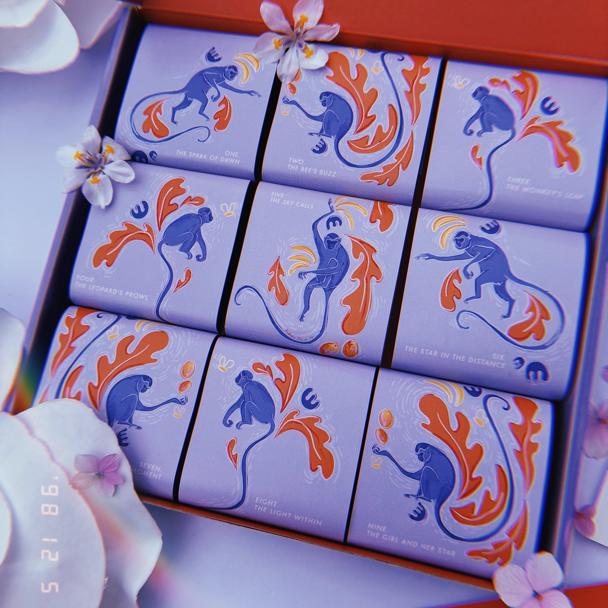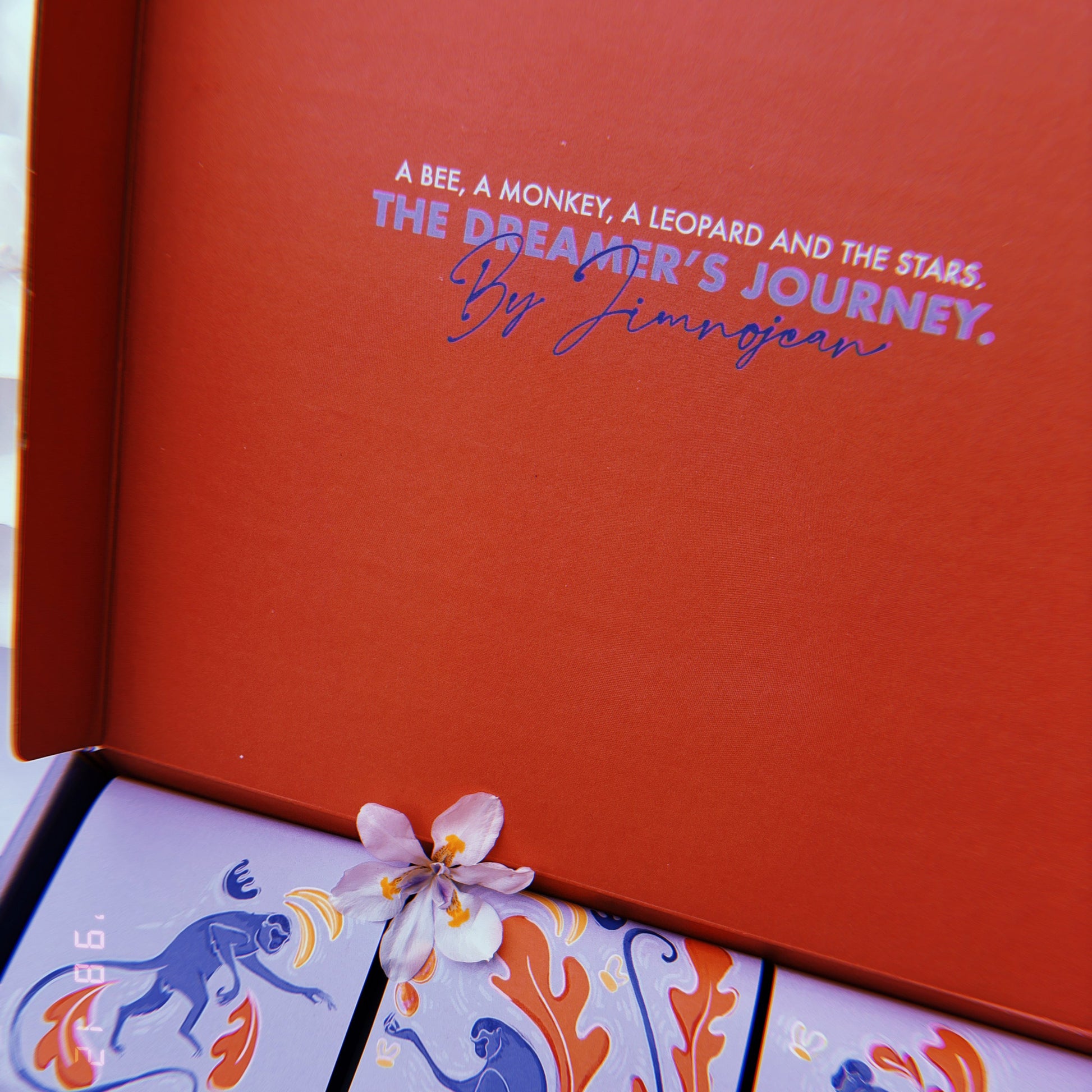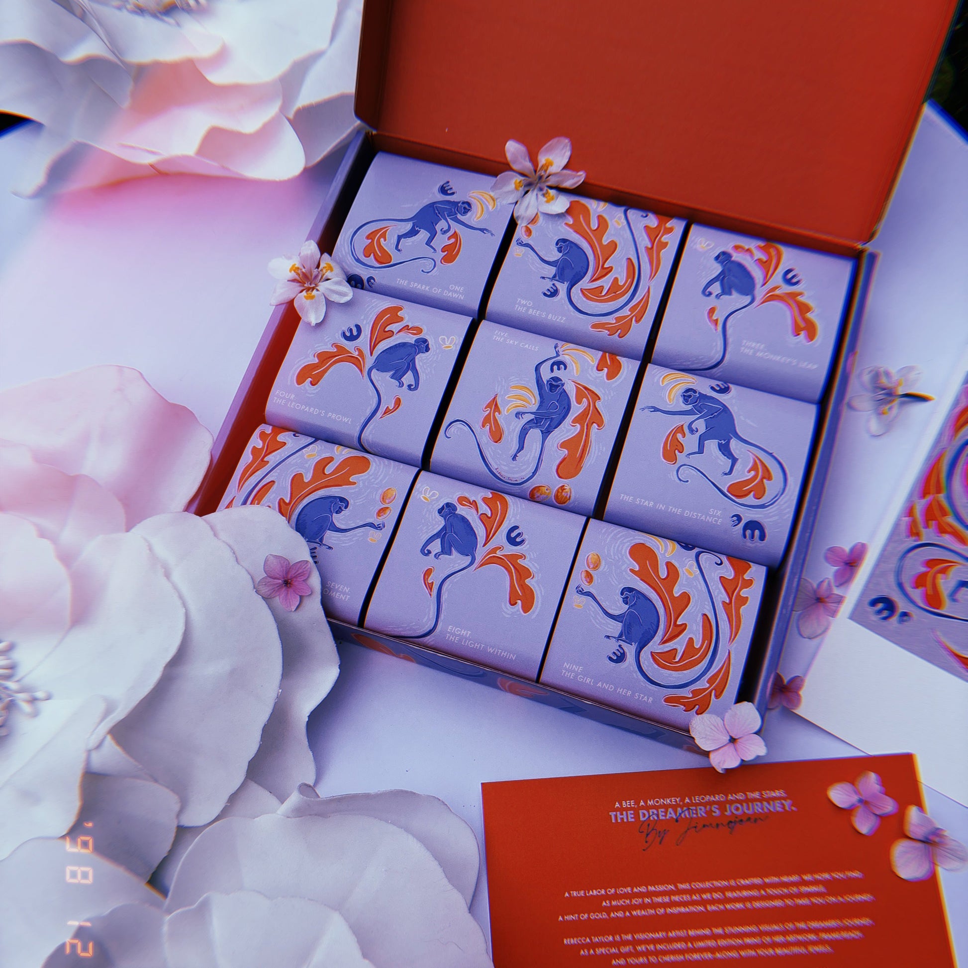 Embark on the journey of your inner dreamer as we take a walk into the night with the Girl, the Bee, the Monkey, and the Leopard. Inspired by the beauty of nature and the magic of dreams, each piece is a one-of-a-kind keepsake with its own special story (literally - there's a piece of the story written in each of the 9 boxes).