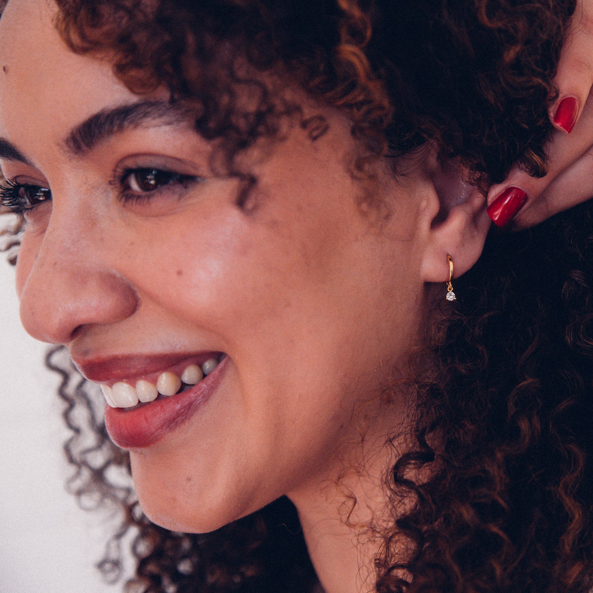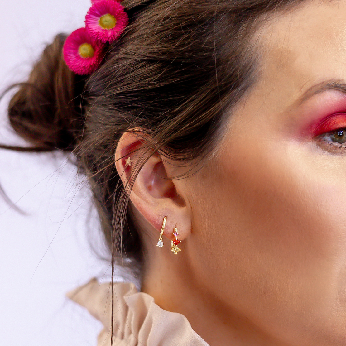 Tori wears the Timeless Huggies here with the Sunset Hoops.
