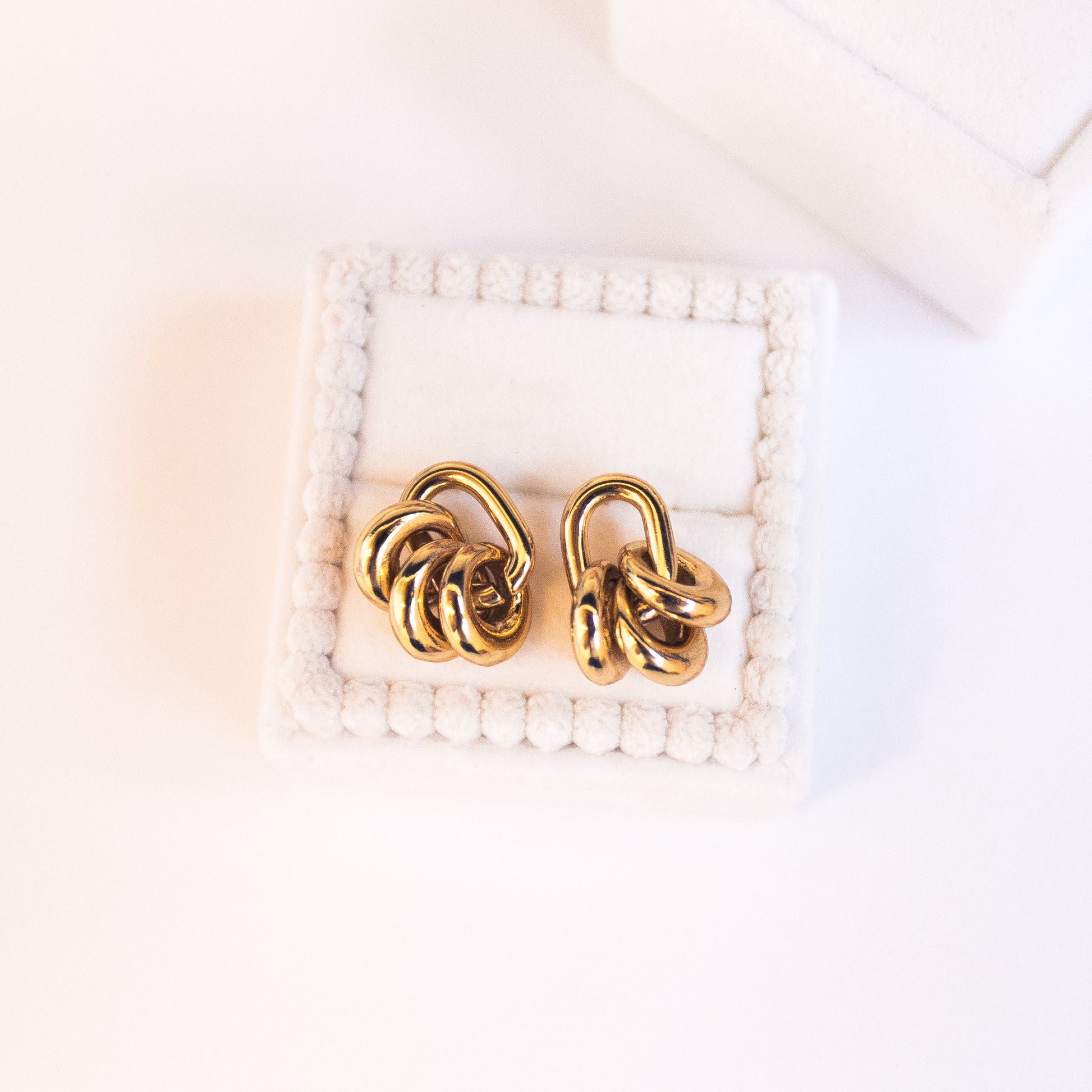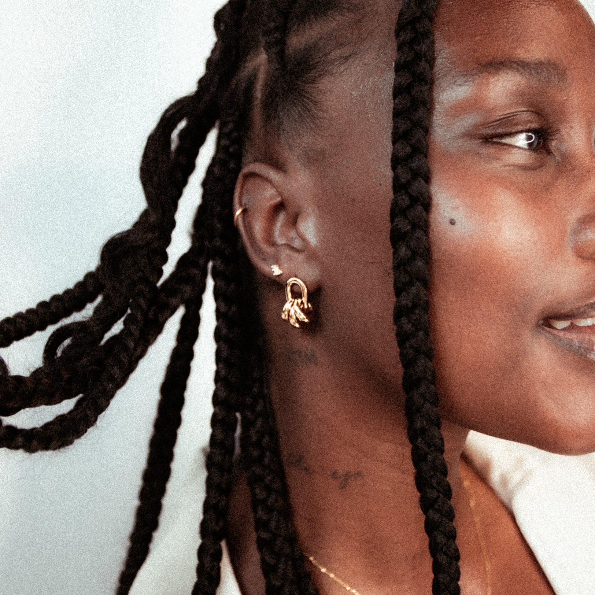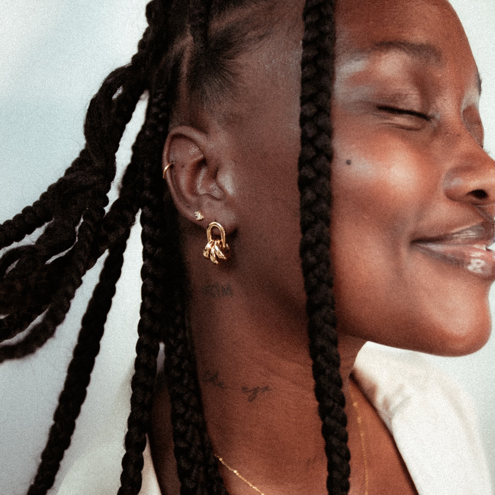 The Vintage drops are paired here with the dainty Cher Studs, worn by Bianca.